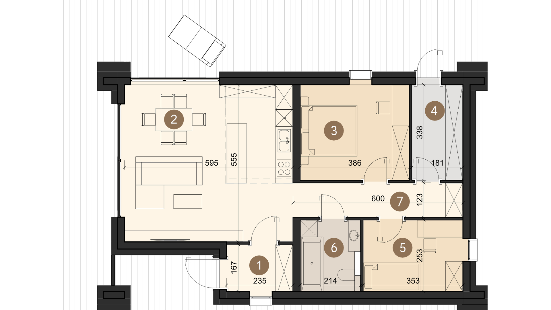 Dex 76 is a comfortable single-story home with a usable area of 76 m², optimally designed for 2 bedrooms. In addition, on the first floor