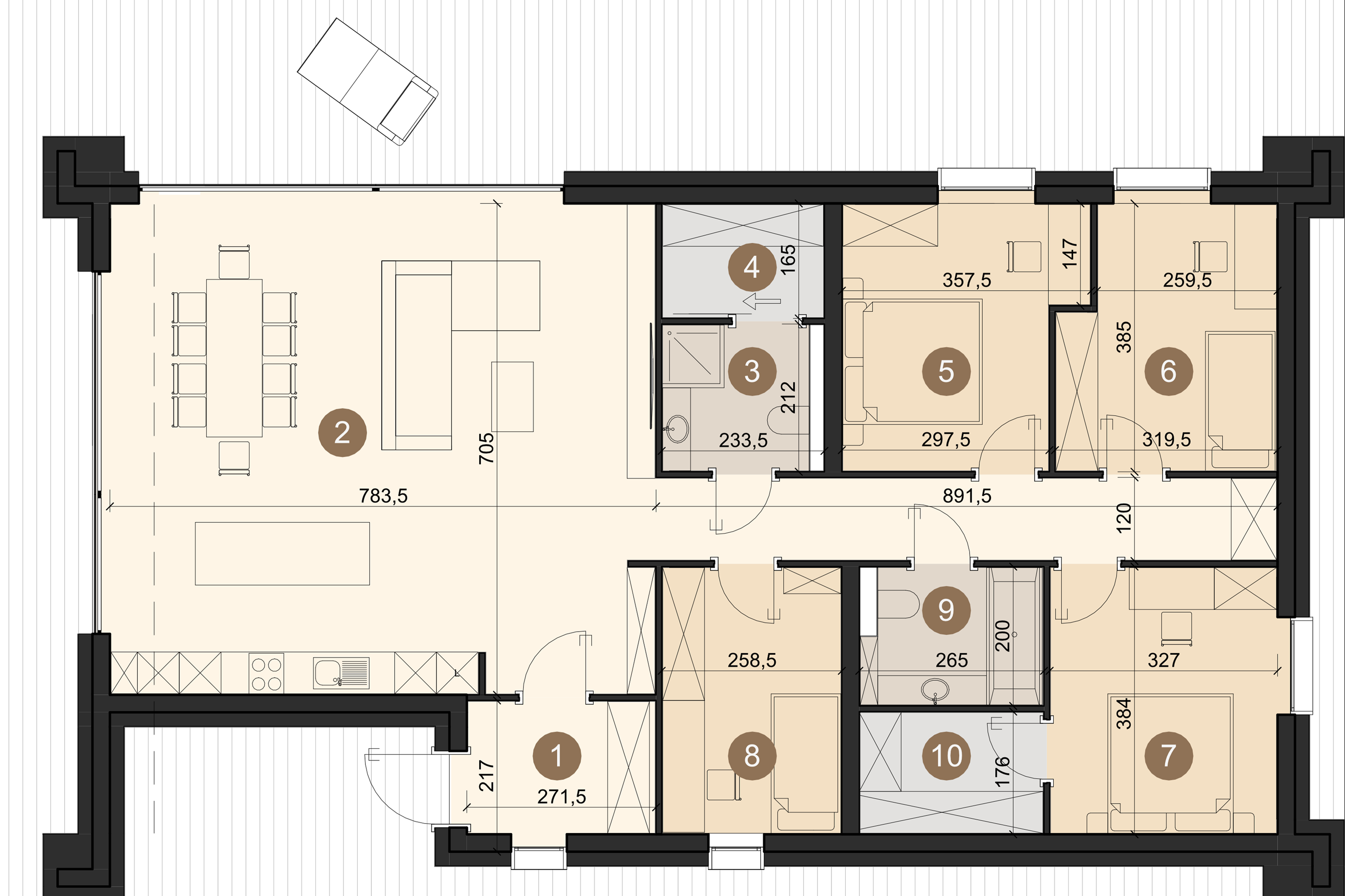 Dex 136 es una práctica casa con una superficie de 136 m², ideal para toda la familia. Ofrece cuatro dormitorios, dos baños y más de 50 m² de una amplia zona de estar que garantiza comodidad y funcionalidad. Uno de los dormitorios se puede convertir fácilmente en una oficina, adaptando el espacio a las necesidades individuales de los residentes. Además, junto al dormitorio principal hay un vestidor cómodo que proporciona mucho espacio de almacenamiento. Esta casa ha sido diseñada pensando en la comodidad y la versatilidad para satisfacer las exigencias de las familias modernas.